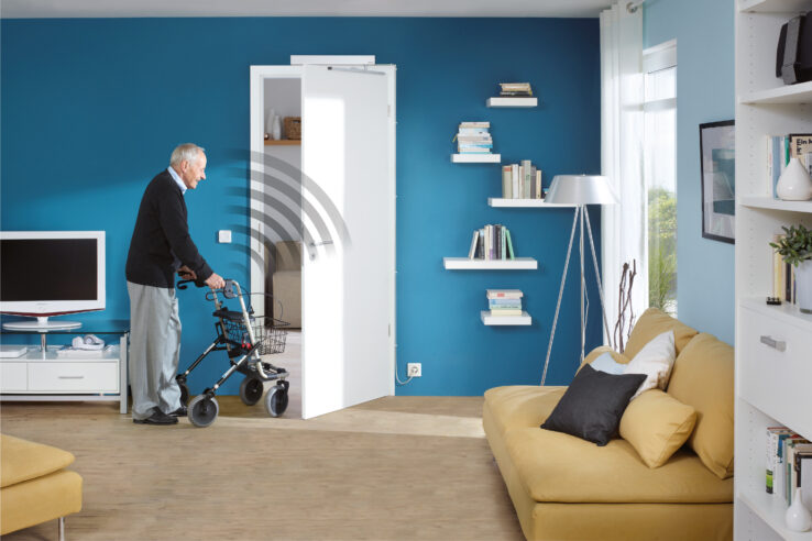 04Juil La motorisation PortaMatic est idéale pour le domicile des personnes à mobilité réduite. Cette motorisation est dédiée aux portes intérieures 1 vantail sans exigence coupe-feu ou anti-fumée et est réversible droite/gauche. La largeur de battant peut aller de 610 à 1100 mm et jusqu’à un poids de 120 kg suivant la configuration. PortaMatic bénéficie d’une sécurité renforcée grâce à un protocole de communication radio crypté bidirectionnel 868°, d’un arrêt sur obstacle et d’une fonction d’inversion. Son installation et son usage sont simplifiés par : Un branchement secteur (230/240 VCA – 50/60 Hz) par prise électrique. Un récepteur intégré 3 canaux bidirectionnels permettant 3 commandes. Un démarrage et un arrêt progressifs gérés par microprocesseur. Un limiteur d’effort. Un éclairage de zone activable jusqu’à 12h. La motorisation est complète avec système radio BiSecur intégré ainsi que bras de force, glissière, gâche et accessoires de fixation. L’ouverture de la porte est possible avec un émetteur, un élément de commande sans contact ou deux boutons poussoirs (en option). Aperçu des avantages de la porte automatique PortaMatic Confort, accessibilité aux personnes âgées et aux personnes à mobilité réduite. Sécurité élevée pendant l’utilisation. Montage rapide par un spécialiste et retrait sans laisser de traces. Le signal sonore et visuel avertit du déplacement de la porte (en option). Eclairage. Consommation électrique minimale. Diverses fonctions complémentaires adaptées à chaque besoin (p. ex. éclairage, signaux sonores/visuels, etc.).